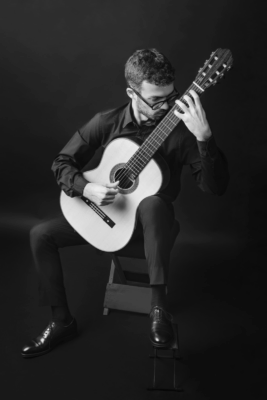 Sante Mileti suona una chitarra modello Hauser costruita dal liutaio tedesco Gerhard Oldiges nel 2021.